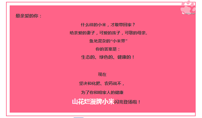 為了咱家人的健康,興縣山花爛漫牌小米只施天然有機(jī)肥,決不讓一?;蔬M(jìn)農(nóng)田,絕不使用殺蟲劑、除草劑,人工種植、人工除草、人工收割,24小時(shí)追溯系統(tǒng)管理,粒粒小米精選,高品質(zhì)的保證!